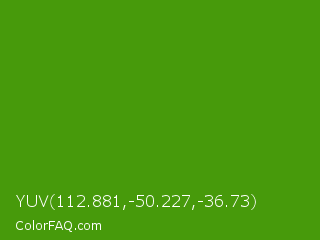 YUV 112.881,-50.227,-36.73 Color is a normal green color and the nearest color is Vida Loca #549019. Hex code #479a0b and RGB value is rgb(71,154,11). In RGB color space, this color is composed of 28% red, 60% green, 4% blue, In CMYK color space, this color is composed of 54% cyan, 0% magenta, 93% yellow , 40% black , In HSL color space, this color has a hue angle of 95° , 87% saturation and 32% lightness.