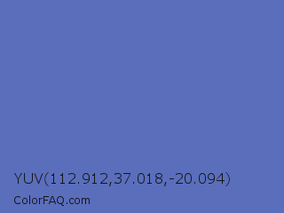 YUV 112.912,37.018,-20.094 Color is a normal blue color and the nearest color is Indigo #4f69c6. Hex code #5a6ebc and RGB value is rgb(90,110,188). In RGB color space, this color is composed of 35% red, 43% green, 74% blue, In CMYK color space, this color is composed of 52% cyan, 41% magenta, 0% yellow , 26% black , In HSL color space, this color has a hue angle of 228° , 42% saturation and 55% lightness.