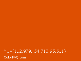 YUV 112.979,-54.713,95.611 Color is a normal orange color and the nearest color is Trinidad #e64e03. Hex code #de4f02 and RGB value is rgb(222,79,2). In RGB color space, this color is composed of 87% red, 31% green, 1% blue, In CMYK color space, this color is composed of 0% cyan, 64% magenta, 99% yellow , 13% black , In HSL color space, this color has a hue angle of 21° , 98% saturation and 44% lightness.