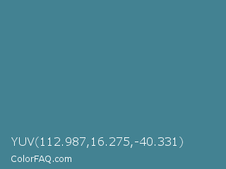 YUV 112.987,16.275,-40.331 Color is a normal cyan color and the nearest color is Smalt Blue #51808f. Hex code #438292 and RGB value is rgb(67,130,146). In RGB color space, this color is composed of 26% red, 51% green, 57% blue, In CMYK color space, this color is composed of 54% cyan, 11% magenta, 0% yellow , 43% black , In HSL color space, this color has a hue angle of 192° , 37% saturation and 42% lightness.