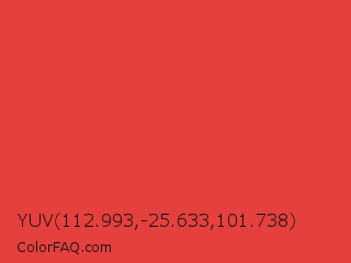 YUV 112.993,-25.633,101.738 Color is a normal red color and the nearest color is Cinnabar #e34234. Hex code #e5403d and RGB value is rgb(229,64,61). In RGB color space, this color is composed of 90% red, 25% green, 24% blue, In CMYK color space, this color is composed of 0% cyan, 72% magenta, 73% yellow , 10% black , In HSL color space, this color has a hue angle of 1° , 76% saturation and 57% lightness.