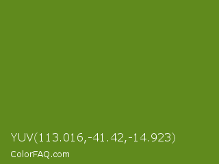 YUV 113.016,-41.42,-14.923 Color is a normal green color and the nearest color is Olive Drab #6b8e23. Hex code #608a1d and RGB value is rgb(96,138,29). In RGB color space, this color is composed of 38% red, 54% green, 11% blue, In CMYK color space, this color is composed of 30% cyan, 0% magenta, 79% yellow , 46% black , In HSL color space, this color has a hue angle of 83° , 65% saturation and 33% lightness.
