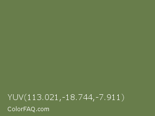 YUV 113.021,-18.744,-7.911 Color is a normal green color and the nearest color is Dingley #5d7747. Hex code #687d4b and RGB value is rgb(104,125,75). In RGB color space, this color is composed of 41% red, 49% green, 29% blue, In CMYK color space, this color is composed of 17% cyan, 0% magenta, 40% yellow , 51% black , In HSL color space, this color has a hue angle of 85° , 25% saturation and 39% lightness.