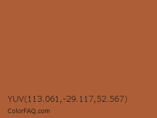 YUV 113.061,-29.117,52.567 Color is a normal orange color and the nearest color is Brown Rust #af593e. Hex code #ad5e36 and RGB value is rgb(173,94,54). In RGB color space, this color is composed of 68% red, 37% green, 21% blue, In CMYK color space, this color is composed of 0% cyan, 46% magenta, 69% yellow , 32% black , In HSL color space, this color has a hue angle of 20° , 52% saturation and 45% lightness.