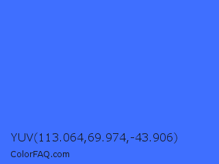 YUV 113.064,69.974,-43.906 Color is a light blue color and the nearest color is Ultramarine Blue #4166f5. Hex code #3f6fff and RGB value is rgb(63,111,255). In RGB color space, this color is composed of 25% red, 44% green, 100% blue, In CMYK color space, this color is composed of 75% cyan, 56% magenta, 0% yellow , 0% black , In HSL color space, this color has a hue angle of 225° , 100% saturation and 62% lightness.