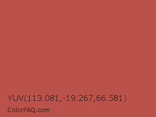 YUV 113.081,-19.267,66.581 Color is a normal red color and the nearest color is Deep Chestnut #b94e48. Hex code #bd524a and RGB value is rgb(189,82,74). In RGB color space, this color is composed of 74% red, 32% green, 29% blue, In CMYK color space, this color is composed of 0% cyan, 57% magenta, 61% yellow , 26% black , In HSL color space, this color has a hue angle of 4° , 47% saturation and 52% lightness.
