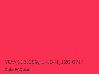 YUV 113.089,-14.341,120.071 Color is a normal red color and the nearest color is Sizzling Red #ff3855. Hex code #fa3154 and RGB value is rgb(250,49,84). In RGB color space, this color is composed of 98% red, 19% green, 33% blue, In CMYK color space, this color is composed of 0% cyan, 80% magenta, 66% yellow , 2% black , In HSL color space, this color has a hue angle of 350° , 95% saturation and 59% lightness.