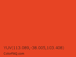 YUV 113.089,-38.005,103.408 Color is a normal red color and the nearest color is Pomegranate #f34723. Hex code #e74424 and RGB value is rgb(231,68,36). In RGB color space, this color is composed of 91% red, 27% green, 14% blue, In CMYK color space, this color is composed of 0% cyan, 71% magenta, 84% yellow , 9% black , In HSL color space, this color has a hue angle of 10° , 80% saturation and 52% lightness.