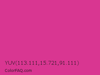 YUV 113.111,15.721,91.111 Color is a normal magenta color and the nearest color is Cerise #da3287. Hex code #d93691 and RGB value is rgb(217,54,145). In RGB color space, this color is composed of 85% red, 21% green, 57% blue, In CMYK color space, this color is composed of 0% cyan, 75% magenta, 33% yellow , 15% black , In HSL color space, this color has a hue angle of 327° , 68% saturation and 53% lightness.