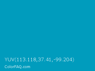 YUV 113.118,37.41,-99.204 Color is a normal cyan color and the nearest color is Pacific Blue Crayola #009dc4. Hex code #009cbd and RGB value is rgb(0,156,189). In RGB color space, this color is composed of 0% red, 61% green, 74% blue, In CMYK color space, this color is composed of 100% cyan, 17% magenta, 0% yellow , 26% black , In HSL color space, this color has a hue angle of 190° , 100% saturation and 37% lightness.