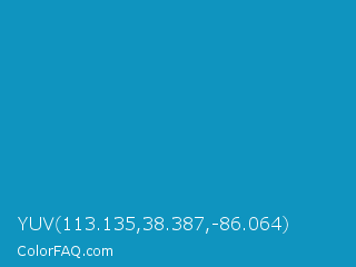 YUV 113.135,38.387,-86.064 Color is a normal blue color and the nearest color is Blue Green #0d98ba. Hex code #0f94bf and RGB value is rgb(15,148,191). In RGB color space, this color is composed of 6% red, 58% green, 75% blue, In CMYK color space, this color is composed of 92% cyan, 23% magenta, 0% yellow , 25% black , In HSL color space, this color has a hue angle of 195° , 85% saturation and 40% lightness.