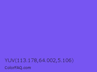 YUV 113.178,64.002,5.106 Color is a light indigo color and the nearest color is Medium Slate Blue #7b68ee. Hex code #7755f3 and RGB value is rgb(119,85,243). In RGB color space, this color is composed of 47% red, 33% green, 95% blue, In CMYK color space, this color is composed of 51% cyan, 65% magenta, 0% yellow , 5% black , In HSL color space, this color has a hue angle of 253° , 87% saturation and 64% lightness.