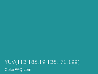 YUV 113.185,19.136,-71.199 Color is a normal cyan color and the nearest color is Blue Chill #0c8990. Hex code #209398 and RGB value is rgb(32,147,152). In RGB color space, this color is composed of 13% red, 58% green, 60% blue, In CMYK color space, this color is composed of 79% cyan, 3% magenta, 0% yellow , 40% black , In HSL color space, this color has a hue angle of 183° , 65% saturation and 36% lightness.