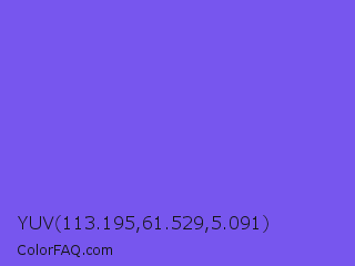 YUV 113.195,61.529,5.091 Color is a light indigo color and the nearest color is Medium Slate Blue #7b68ee. Hex code #7756ee and RGB value is rgb(119,86,238). In RGB color space, this color is composed of 47% red, 34% green, 93% blue, In CMYK color space, this color is composed of 50% cyan, 64% magenta, 0% yellow , 7% black , In HSL color space, this color has a hue angle of 253° , 82% saturation and 64% lightness.
