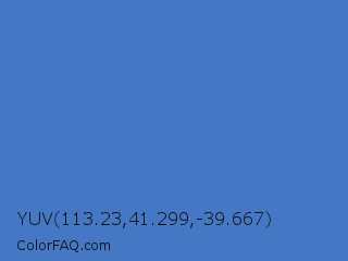 YUV 113.23,41.299,-39.667 Color is a normal blue color and the nearest color is Cyan Blue Azure #4682bf. Hex code #4478c5 and RGB value is rgb(68,120,197). In RGB color space, this color is composed of 27% red, 47% green, 77% blue, In CMYK color space, this color is composed of 65% cyan, 39% magenta, 0% yellow , 23% black , In HSL color space, this color has a hue angle of 216° , 53% saturation and 52% lightness.