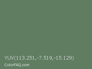 YUV 113.251,-7.519,-15.129 Color is a normal green color and the nearest color is Glade Green #61845f. Hex code #607d62 and RGB value is rgb(96,125,98). In RGB color space, this color is composed of 38% red, 49% green, 38% blue, In CMYK color space, this color is composed of 23% cyan, 0% magenta, 22% yellow , 51% black , In HSL color space, this color has a hue angle of 124° , 13% saturation and 43% lightness.