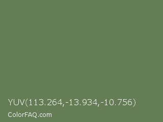 YUV 113.264,-13.934,-10.756 Color is a normal green color and the nearest color is Willow Grove #65745d. Hex code #657d55 and RGB value is rgb(101,125,85). In RGB color space, this color is composed of 40% red, 49% green, 33% blue, In CMYK color space, this color is composed of 19% cyan, 0% magenta, 32% yellow , 51% black , In HSL color space, this color has a hue angle of 96° , 19% saturation and 41% lightness.