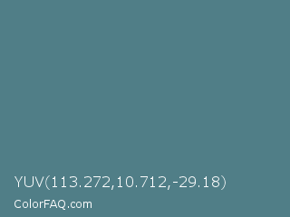 YUV 113.272,10.712,-29.18 Color is a normal cyan color and the nearest color is Smalt Blue #51808f. Hex code #507e87 and RGB value is rgb(80,126,135). In RGB color space, this color is composed of 31% red, 49% green, 53% blue, In CMYK color space, this color is composed of 41% cyan, 7% magenta, 0% yellow , 47% black , In HSL color space, this color has a hue angle of 190° , 26% saturation and 42% lightness.