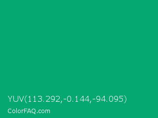 YUV 113.292,-0.144,-94.095 Color is a normal green color and the nearest color is Green Munsell #00a877. Hex code #06a871 and RGB value is rgb(6,168,113). In RGB color space, this color is composed of 2% red, 66% green, 44% blue, In CMYK color space, this color is composed of 96% cyan, 0% magenta, 33% yellow , 34% black , In HSL color space, this color has a hue angle of 160° , 93% saturation and 34% lightness.
