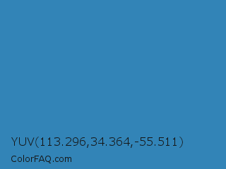 YUV 113.296,34.364,-55.511 Color is a normal blue color and the nearest color is Boston Blue #3b91b4. Hex code #3284b7 and RGB value is rgb(50,132,183). In RGB color space, this color is composed of 20% red, 52% green, 72% blue, In CMYK color space, this color is composed of 73% cyan, 28% magenta, 0% yellow , 28% black , In HSL color space, this color has a hue angle of 203° , 57% saturation and 46% lightness.