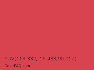 YUV 113.332,-16.433,90.917 Color is a normal red color and the nearest color is English Vermillion #cc474b. Hex code #d94350 and RGB value is rgb(217,67,80). In RGB color space, this color is composed of 85% red, 26% green, 31% blue, In CMYK color space, this color is composed of 0% cyan, 69% magenta, 63% yellow , 15% black , In HSL color space, this color has a hue angle of 355° , 66% saturation and 56% lightness.
