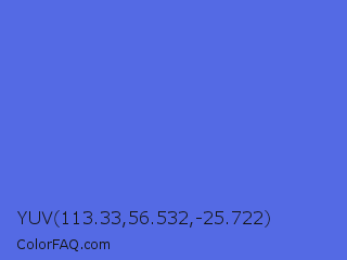YUV 113.33,56.532,-25.722 Color is a light blue color and the nearest color is Royal Blue #4169e1. Hex code #546ae4 and RGB value is rgb(84,106,228). In RGB color space, this color is composed of 33% red, 42% green, 89% blue, In CMYK color space, this color is composed of 63% cyan, 54% magenta, 0% yellow , 11% black , In HSL color space, this color has a hue angle of 231° , 73% saturation and 61% lightness.