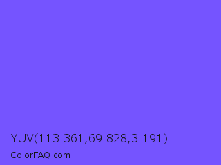 YUV 113.361,69.828,3.191 Color is a light indigo color and the nearest color is Very Light Blue #6666ff. Hex code #7554ff and RGB value is rgb(117,84,255). In RGB color space, this color is composed of 46% red, 33% green, 100% blue, In CMYK color space, this color is composed of 54% cyan, 67% magenta, 0% yellow , 0% black , In HSL color space, this color has a hue angle of 252° , 100% saturation and 66% lightness.