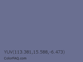 YUV 113.381,15.588,-6.473 Color is a normal blue color and the nearest color is Dark Blue Gray #666699. Hex code #6a6f91 and RGB value is rgb(106,111,145). In RGB color space, this color is composed of 42% red, 44% green, 57% blue, In CMYK color space, this color is composed of 27% cyan, 23% magenta, 0% yellow , 43% black , In HSL color space, this color has a hue angle of 232° , 16% saturation and 49% lightness.