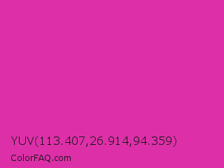 YUV 113.407,26.914,94.359 Color is a normal magenta color and the nearest color is Frostbite #e936a7. Hex code #dd30a8 and RGB value is rgb(221,48,168). In RGB color space, this color is composed of 87% red, 19% green, 66% blue, In CMYK color space, this color is composed of 0% cyan, 78% magenta, 24% yellow , 13% black , In HSL color space, this color has a hue angle of 318° , 72% saturation and 53% lightness.