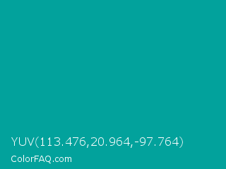 YUV 113.476,20.964,-97.764 Color is a normal cyan color and the nearest color is Persian Green #00a693. Hex code #02a29c and RGB value is rgb(2,162,156). In RGB color space, this color is composed of 1% red, 64% green, 61% blue, In CMYK color space, this color is composed of 99% cyan, 0% magenta, 4% yellow , 36% black , In HSL color space, this color has a hue angle of 178° , 98% saturation and 32% lightness.