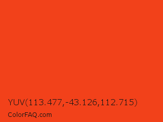 YUV 113.477,-43.126,112.715 Color is a normal red color and the nearest color is Pomegranate #f34723. Hex code #f2411a and RGB value is rgb(242,65,26). In RGB color space, this color is composed of 95% red, 25% green, 10% blue, In CMYK color space, this color is composed of 0% cyan, 73% magenta, 89% yellow , 5% black , In HSL color space, this color has a hue angle of 11° , 89% saturation and 53% lightness.
