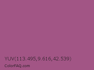 YUV 113.495,9.616,42.539 Color is a normal magenta color and the nearest color is Tapestry #b05e81. Hex code #a25585 and RGB value is rgb(162,85,133). In RGB color space, this color is composed of 64% red, 33% green, 52% blue, In CMYK color space, this color is composed of 0% cyan, 48% magenta, 18% yellow , 36% black , In HSL color space, this color has a hue angle of 323° , 31% saturation and 48% lightness.