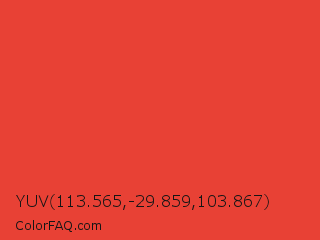 YUV 113.565,-29.859,103.867 Color is a normal red color and the nearest color is Cinnabar #e34234. Hex code #e84135 and RGB value is rgb(232,65,53). In RGB color space, this color is composed of 91% red, 25% green, 21% blue, In CMYK color space, this color is composed of 0% cyan, 72% magenta, 77% yellow , 9% black , In HSL color space, this color has a hue angle of 4° , 80% saturation and 56% lightness.