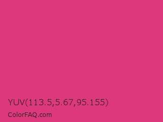 YUV 113.5,5.67,95.155 Color is a normal rose color and the nearest color is Cerise #da3287. Hex code #de387d and RGB value is rgb(222,56,125). In RGB color space, this color is composed of 87% red, 22% green, 49% blue, In CMYK color space, this color is composed of 0% cyan, 75% magenta, 44% yellow , 13% black , In HSL color space, this color has a hue angle of 335° , 72% saturation and 55% lightness.