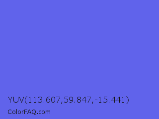 YUV 113.607,59.847,-15.441 Color is a light blue color and the nearest color is Very Light Blue #6666ff. Hex code #6063eb and RGB value is rgb(96,99,235). In RGB color space, this color is composed of 38% red, 39% green, 92% blue, In CMYK color space, this color is composed of 59% cyan, 58% magenta, 0% yellow , 8% black , In HSL color space, this color has a hue angle of 239° , 78% saturation and 65% lightness.