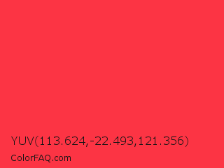 YUV 113.624,-22.493,121.356 Color is a normal red color and the nearest color is Red Salsa #fd3a4a. Hex code #fc3444 and RGB value is rgb(252,52,68). In RGB color space, this color is composed of 99% red, 20% green, 27% blue, In CMYK color space, this color is composed of 0% cyan, 79% magenta, 73% yellow , 1% black , In HSL color space, this color has a hue angle of 355° , 97% saturation and 60% lightness.
