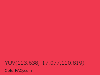 YUV 113.638,-17.077,110.819 Color is a normal red color and the nearest color is Desire #ea3c53. Hex code #f0384f and RGB value is rgb(240,56,79). In RGB color space, this color is composed of 94% red, 22% green, 31% blue, In CMYK color space, this color is composed of 0% cyan, 77% magenta, 67% yellow , 6% black , In HSL color space, this color has a hue angle of 353° , 86% saturation and 58% lightness.