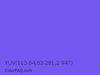 YUV 113.64,63.281,2.947 Color is a light indigo color and the nearest color is Medium Slate Blue #7b68ee. Hex code #7557f2 and RGB value is rgb(117,87,242). In RGB color space, this color is composed of 46% red, 34% green, 95% blue, In CMYK color space, this color is composed of 52% cyan, 64% magenta, 0% yellow , 5% black , In HSL color space, this color has a hue angle of 252° , 86% saturation and 65% lightness.