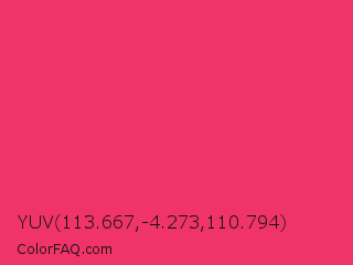 YUV 113.667,-4.273,110.794 Color is a normal rose color and the nearest color is Paradise Pink #e63e62. Hex code #f03369 and RGB value is rgb(240,51,105). In RGB color space, this color is composed of 94% red, 20% green, 41% blue, In CMYK color space, this color is composed of 0% cyan, 79% magenta, 56% yellow , 6% black , In HSL color space, this color has a hue angle of 343° , 86% saturation and 57% lightness.