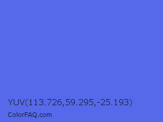 YUV 113.726,59.295,-25.193 Color is a light blue color and the nearest color is Royal Blue #4169e1. Hex code #5569ea and RGB value is rgb(85,105,234). In RGB color space, this color is composed of 33% red, 41% green, 92% blue, In CMYK color space, this color is composed of 64% cyan, 55% magenta, 0% yellow , 8% black , In HSL color space, this color has a hue angle of 232° , 78% saturation and 63% lightness.