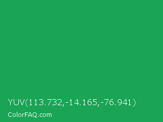YUV 113.732,-14.165,-76.941 Color is a normal green color and the nearest color is Green Pigment #00a550. Hex code #1aa455 and RGB value is rgb(26,164,85). In RGB color space, this color is composed of 10% red, 64% green, 33% blue, In CMYK color space, this color is composed of 84% cyan, 0% magenta, 48% yellow , 36% black , In HSL color space, this color has a hue angle of 146° , 73% saturation and 37% lightness.