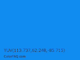 YUV 113.737,62.248,-85.715 Color is a normal blue color and the nearest color is Dodger Blue #1e90ff. Hex code #108bf0 and RGB value is rgb(16,139,240). In RGB color space, this color is composed of 6% red, 55% green, 94% blue, In CMYK color space, this color is composed of 93% cyan, 42% magenta, 0% yellow , 6% black , In HSL color space, this color has a hue angle of 207° , 88% saturation and 50% lightness.