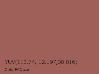 YUV 113.74,-12.197,38.816 Color is a normal red color and the nearest color is Au Chico #97605d. Hex code #9e6059 and RGB value is rgb(158,96,89). In RGB color space, this color is composed of 62% red, 38% green, 35% blue, In CMYK color space, this color is composed of 0% cyan, 39% magenta, 44% yellow , 38% black , In HSL color space, this color has a hue angle of 6° , 28% saturation and 48% lightness.