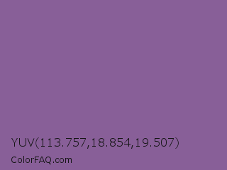 YUV 113.757,18.854,19.507 Color is a normal purple color and the nearest color is Trendy Pink #8c6495. Hex code #885f98 and RGB value is rgb(136,95,152). In RGB color space, this color is composed of 53% red, 37% green, 60% blue, In CMYK color space, this color is composed of 11% cyan, 38% magenta, 0% yellow , 40% black , In HSL color space, this color has a hue angle of 283° , 23% saturation and 48% lightness.