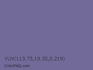 YUV 113.75,19.35,0.219 Color is a normal indigo color and the nearest color is Kimberly #736c9f. Hex code #726a99 and RGB value is rgb(114,106,153). In RGB color space, this color is composed of 45% red, 42% green, 60% blue, In CMYK color space, this color is composed of 25% cyan, 31% magenta, 0% yellow , 40% black , In HSL color space, this color has a hue angle of 250° , 19% saturation and 51% lightness.