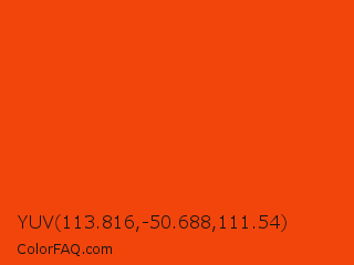 YUV 113.816,-50.688,111.54 Color is a normal color and the nearest color is Tangelo #f94d00. Hex code #f1450b and RGB value is rgb(241,69,11). In RGB color space, this color is composed of 95% red, 27% green, 4% blue, In CMYK color space, this color is composed of 0% cyan, 71% magenta, 95% yellow , 5% black , In HSL color space, this color has a hue angle of 15° , 91% saturation and 49% lightness.