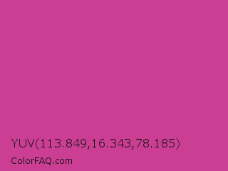 YUV 113.849,16.343,78.185 Color is a normal magenta color and the nearest color is Magenta Pink #cc338b. Hex code #cb3e93 and RGB value is rgb(203,62,147). In RGB color space, this color is composed of 80% red, 24% green, 58% blue, In CMYK color space, this color is composed of 0% cyan, 69% magenta, 28% yellow , 20% black , In HSL color space, this color has a hue angle of 324° , 58% saturation and 52% lightness.