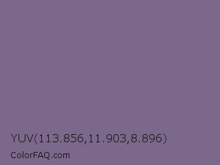 YUV 113.856,11.903,8.896 Color is a normal purple color and the nearest color is Rum #796989. Hex code #7c688a and RGB value is rgb(124,104,138). In RGB color space, this color is composed of 49% red, 41% green, 54% blue, In CMYK color space, this color is composed of 10% cyan, 25% magenta, 0% yellow , 46% black , In HSL color space, this color has a hue angle of 275° , 14% saturation and 47% lightness.