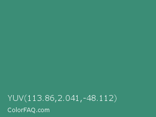YUV 113.86,2.041,-48.112 Color is a normal green color and the nearest color is Illuminating Emerald #319177. Hex code #3b8d76 and RGB value is rgb(59,141,118). In RGB color space, this color is composed of 23% red, 55% green, 46% blue, In CMYK color space, this color is composed of 58% cyan, 0% magenta, 16% yellow , 45% black , In HSL color space, this color has a hue angle of 163° , 41% saturation and 39% lightness.