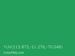 YUV 113.873,-11.276,-70.049 Color is a normal green color and the nearest color is Eucalyptus #278a5b. Hex code #229f5b and RGB value is rgb(34,159,91). In RGB color space, this color is composed of 13% red, 62% green, 36% blue, In CMYK color space, this color is composed of 79% cyan, 0% magenta, 43% yellow , 38% black , In HSL color space, this color has a hue angle of 147° , 65% saturation and 38% lightness.